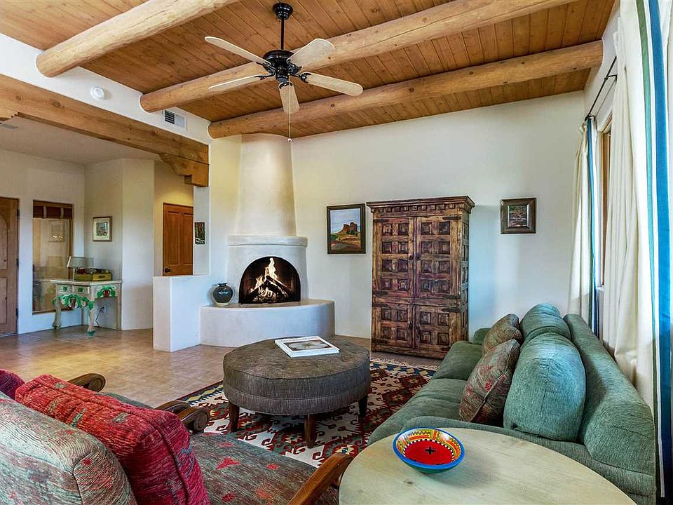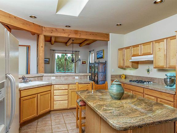 Sparkling elegant and spacious Eldorado residence with skylights creating a light and bright home, bordering a greenbelt. Split bedroom, open floor plan centered on a grand living room with a kiva fireplace and tall viga ceiling, an adjoining formal dining room and kitchen with a large island, breakfast bar and cozy breakfast nook, plus a separate den. Spacious owner's suite includes a kiva fireplace, well- lit master bath with separate jet tub and shower. Natural gas forced air heating with central air conditioning- easy to adjust to the changing Santa Fe weather conditions. A delightful entertainer's portal with fireplace for outside enjoyment overlooks the "greenbelt" with stunning mountain views. There is an orchard with apples, plums and choke cherries plus a landscaped walled entry courtyard too. An oversized finished 2 car garage with plenty of extra room for storage. Enjoy living in this lovely home with a rural feeling yet so close to Eldorado facilities and local amenities.