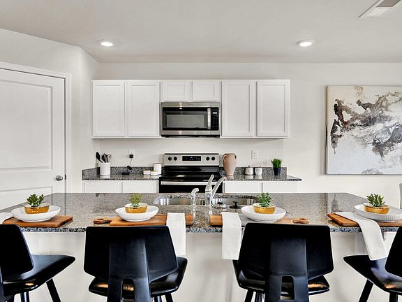 The Darwin floorplan available at Evergreen Landing in Rossville, GA is a charming two-story home. The main level is open concept, featuring a spacious kitchen with a pantry and island with countertop seating. The kitchen overlooks an expansive living area, a well-lit breakfast nook, and an outdoor patio. There is also a powder room off the foyer for convenience. Upstairs features a desirable primary bedroom with a walk-in-closet and private bathroom. Two additional bedrooms are also on the upper level, and these each have their own walk-in-closet. An additional bathroom and laundry room complete the upstairs of this home.