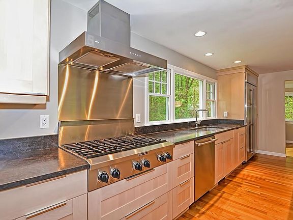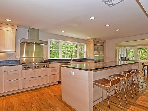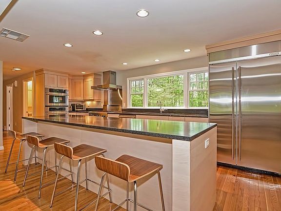- Kit Dscrp: Flooring - Hardwood, Countertops - Stone/Granite/Solid, Kitchen Island, Stainless Steel Appliances, Open Floor Plan, Recessed Lighting, Remodeled, Wine Chiller