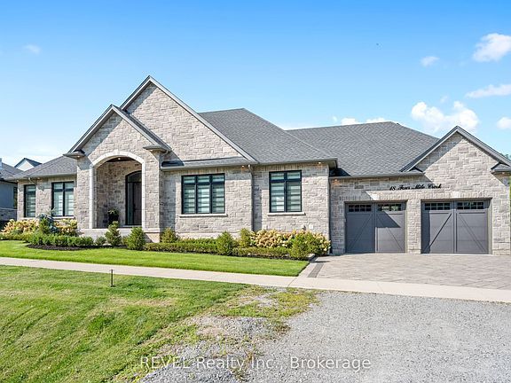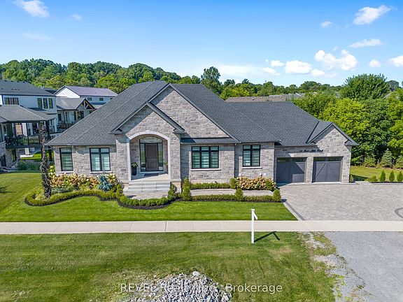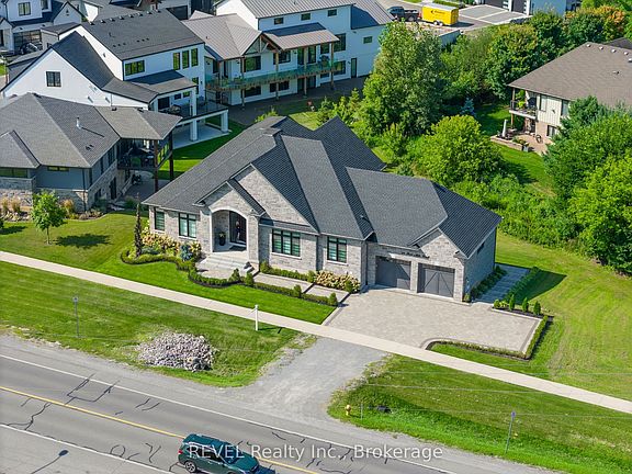 Welcome to this stunning custom-built stone bungalow with 2,750 sqft of finished living space, on a large irregular pie-shaped lot with mature trees. Step into a spacious front foyer leading to an open-concept main floor, where luxury meets comfort. The kitchen is a chef's dream, featuring Traditional and Contemporary design features, large island with a built-in dishwasher, bar top seating andFrigidaire Professional Series appliances. Quartz countertops throughout, Engineered Hardwood and ceramic tile flooring. A walk-in pantry off the dining area offers a wine cooler, prep sink, and extra storage. The living room boasts a cozy electric fireplace and a coffered ceiling, while the dining area opens to a rear deck, perfect for entertaining. The master bedroom suite includes a walk-in closet and a 4-piece ensuite with a large walk-in tiled shower. Two additional bedrooms share a 3-piece bath with another walk-in shower, plus a convenient 2-piece powder room. Outdoor living is a delight with a rear covered porch featuring a gas BBQ hookup and composite decking, and a 3-season sunroom with vaulted ceilings by Outdoor LivingDesigns. The 300 sqft finished basement area offers extra living space, with potential for an in-law suite in the unfinished section, complete with a full walkout and roughed-in 3-piece bathroom. A private hot tub area adds to the appeal. The fully landscaped property includes a sprinkler system, lighting, interlocking stone patios, and walkways. An oversized 2-car garage provides ample storage. Located near wineries, restaurants, shopping, and with easy access to the QEW and Lewiston-Queenston Border Bridge, this home offers the perfect blend of luxury and convenience.**EXTRAS** tankless water heater, basement fridge