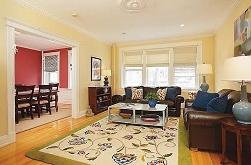 This beautiful floor-through condo with 1696 square feet of living space is minutes from Coolidge Corner. The spacious foyer has been customized as an office with a built-in desk and open shelving. Off of the foyer is the bright living room which leads to the equally large dining room. The wonderful kitchen offers ample storage, stainless appliances and in-unit laundry. There is a sitting area off of the kitchen that would be well-suited as a breakfast room. Off of the sitting area is the spacious master bedroom with a door to the private four season sunroom. The second bedroom is also adjacent to the sitting room and has an en suite bathroom, in addition to the full bathroom in the hallway. Currently used as a den with built-in shelving, the third bedroom is located off of the foyer and offers privacy for guests. Professionally managed association with high owner occupancy and easy access to B and C lines. One assigned garage parking space.