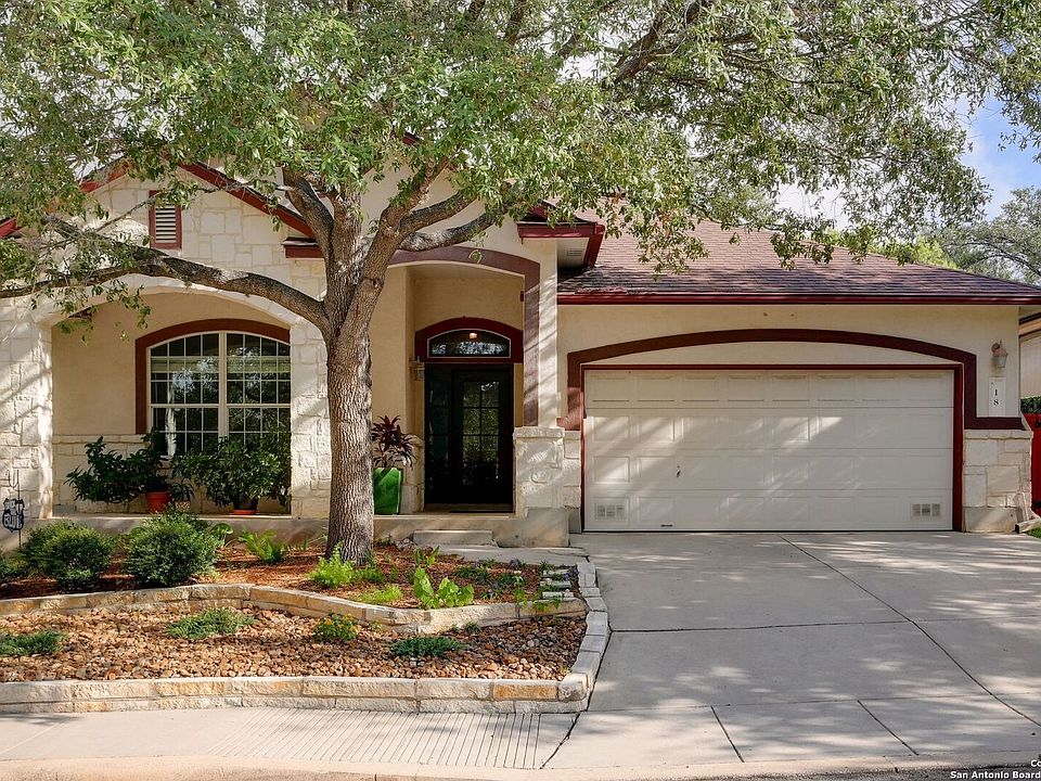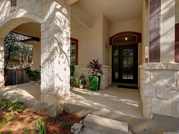 Gorgeous well-built 3Bd/2.5Ba in the Gardens of Hollywood Park! Featuring a spacious floor plan, beautiful custom front door, large living room w/gas fireplace, 2 dining areas, a versatile sunroom, fantastic kitchen with solid surface counters, lots of cabinet & counter space, gas cooktop, double ovens & built-in microwave. Peaceful primary suite offers a separate tub & shower plus a large walk-in closet. Extras include a giant pantry / laundry room, all tile floors, art niche, wood accents, trayed ceilings & water softener. Beautiful, low-maintenance yard with gorgeous mature trees, you'll love the private stone patio-great for entertaining! Enjoy coffee on the front porch while watching the deer across the street at the private homeowners park with walking/running trails, wildlife & picnic areas. Quiet, mature neighborhood with homeowners-only gate offering quick access to Hwy 281. Just 1.5 miles from Voigt Park with pool, splash pad, sports courts, playground & the Voigt Center-available for private events. This home is remarkable & move-in ready!!!
