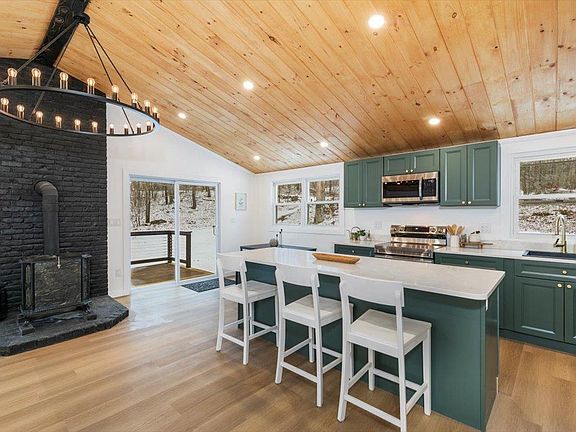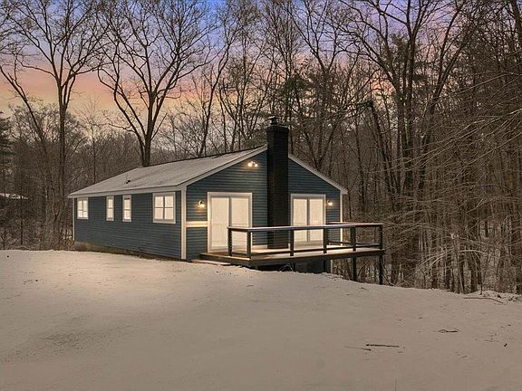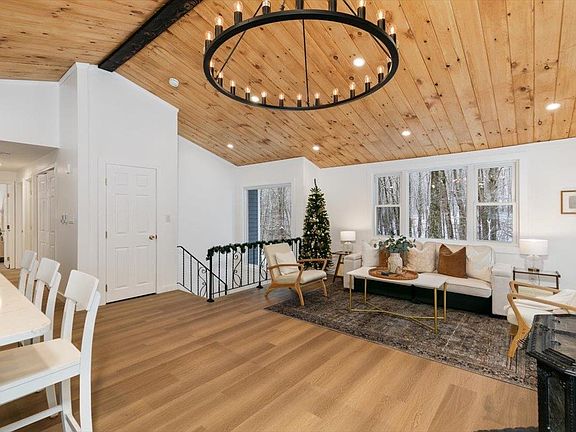 Offer deadline: Tuesday 12/17 at 12PM. Start the new year off with a bang in this completely renovated gorgeous ranch! Sitting on over 5 acres, this cozy, rustic escape is perfection. The sun filled, open concept kitchen and living room feature soaring pine ceilings, a wood stove and a statement chandelier. The eat in kitchen is brand new with granite countertops, new cabinetry, and all new SS appliances. Enjoy the views of your 5 acres of forest as you gaze out the brand new, large windows. Down the hallway you'll find a closet with laundry hookups, 3 bedrooms and a stunning full bath. The basement is newly finished with a living space/game room, plus one more bonus room, and a 1 car garage underneath. Outside you'll find a deck that leads to the front yard w/ fresh loam and grass seed ready for spring. New in 2024: roof, electric baseboard system, electric panel, kitchen, bathroom, flooring, interior and exterior paint. Recent septic inspection available upon request, system is in good condition. Broker interest, agent interest. Showings begin at open house on 12/14/24.