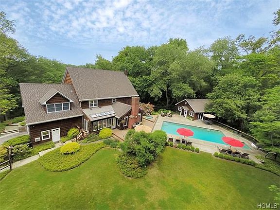 Extremely Private Five Bedroom Mini-Estate on 2 Professionally landscaped acres located in Armonk. The stone and cedar Center Hall Colonial offers Four Bedrooms, Three Full and Two Half Baths. A Two Story Entry Foyer flows beautifully from the Living Room, Banquet-sized Dining Room, Kitchen and Family Room with a vaulted ceiling, an entertainer's delight! Spacious rooms and so many windows let in the beautiful natural light, bringing the outdoors in. 1,056 sq ft lower level recreation room with surround sound has a Certificate of Occupancy and is included in the total square footage. A fully equipped 700 square foot, One Bedroom, One Bath Guest Cottage with cathedral ceiling is also located on the property and is included in the total square footage, bed and bath count. Beautifully landscaped grounds with Perennial Gardens, Fieldstone Walls, Bluestone Patios, Deck, Inground Pool with Lap Lane and Spa complete this property. Perfect for year round entertaining..not to be missed!