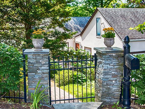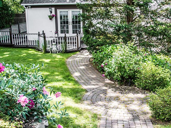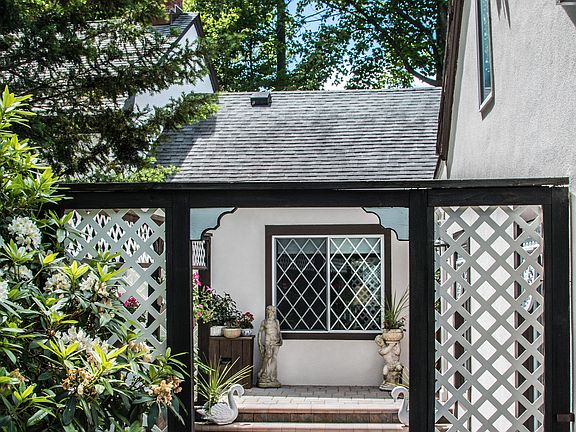 Beautiful Renovated Unique Carriage House Walking Distance From Huntington Village. This charming home on a lush .23 acre lot has a new paver entryway and stucco exterior surrounded by multi-level decks. Original coach house built in 1920 with newer extension 1999. It has been beautifully renovated creating lots of drama and open space. All rooms have vaulted ceilings. Perfect for entertaining, the large great room with stone fireplace and high beamed ceiling opens out to a multi-level deck and pond. The kitchen has new stainless steel appliances, granite counters and gas stove. The Library has vaulted ceiling, brick floor and sliding ladder. There are two large master bedrooms with high ceilings and adjoining bathrooms. Gas Heat. AC. Furniture optional.