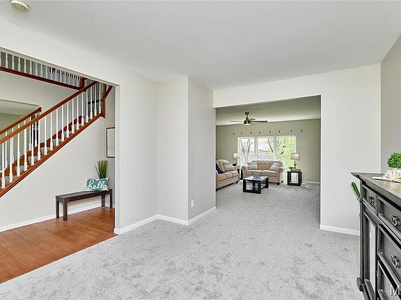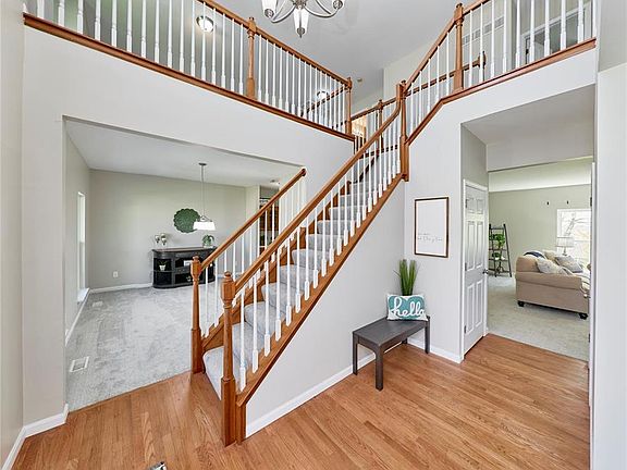 Nestled on a quiet cul-de-sac this 4-bedroom, 4.5-bath home offers spectacular sunset views. Updated in 2024-2025, the home features refinished hardwood floors in the kitchen & hearth room, along w/ new windows, carpet, paint, siding, light fixtures, backsplash, & LVP flooring. The main floor boasts 9-ft ceilings, sep. dining room, office, hearth room & family room w/ 2nd wburning fireplace. The eat-in kitchen shines w/ a bay window, island, & 42” cabinetry. Upstairs, a spacious loft is perfect for a movie/game room. The primary suite includes a vaulted ceiling, walk-in closet, soaker tub, separate shower & linen closet. There is a large upper-level laundry room, hall bath, 2nd bedroom all off the loft area & the 3rd & 4 bedrooms share a jacknjill bath. The lower level is partially finished w/ a kitchenette, extra washer/dryer hookups, drywall walls, recessed lighting, full bath & concrete floors. Dual HVAC (2 yr), roof (5yr). Deck is needed to complete the backyard space.