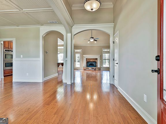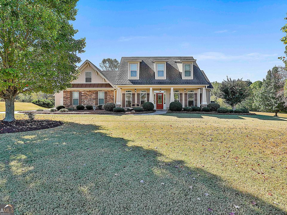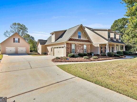 Beautiful Craftsman-Style Home Minutes from Downtown Senoia! Welcome home to this stunning 4-bedroom, 3-bath Craftsman in Country Lake Estates, perfectly situated on approximately 2.75 acres (two adjoining lots). Enjoy fresh interior paint, new carpet in the bedrooms, beautiful trim work and timeless design details throughout. The spacious kitchen features granite countertops, custom cabinetry, a walk-in pantry, breakfast bar, and sunny breakfast area. Stainless steel appliances include double ovens, cooktop, built-in microwave, dishwasher, and refrigerator. Entertain in the formal dining room with beamed ceiling, or relax in the large great room with a vaulted ceiling and stone fireplace with propane gas logs. The covered back porch with its own fireplace extends your living space outdoors, offering peaceful views of the private, wooded backyard. The owner's suite on the main level includes a tray ceiling, ceiling fan, and a luxurious bath with double vanities, jetted tub, walk-in shower, and large walk-in closet, and linen closet inside toilet room. A split-bedroom layout provides two additional main-level bedrooms with spacious closets and ceiling fans, and a full bath in hallway with a linen closet. Upstairs, you'll find a versatile bonus room or fourth bedroom with a walk-in closet and private full bath - perfect for guests! Two car garage plus an additional detached two-car garage with an unfinished bonus room provides endless possibilities for parking, storage, a workshop, or future office space. This beautiful property combines comfort, craftsmanship, and extra land - all just minutes from Senoia's charming downtown shops and restaurants! Country Lake Estates owners also enjoy a small private lake within the neighborhood.