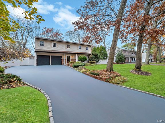 This incredible opportunity offers a magnificent oversized Colonial positioned mid-block on a quiet dead-end street with no cut-through traffic, sitting on one of the largest lots and one of the largest homes in the entire development. Located in the highly sought-after Smithtown School District, the exterior features an expanded blacktop driveway with a Belgian block border, beautiful vinyl siding with a partial front brick facade, and white vinyl front fencing and 10 year young roof. The backyard is a true resort setting with multiple entertaining areas, including a fully fenced inground swimming pool with a 5 year young electric heater, a stunning brick patio surrounding the pool, a large Trex deck, and several additional spaces designed for hosting, relaxing, dining, and enjoying outdoor living to the fullest. Inside, the home offers an open floor plan with hardwood floors throughout the main principal rooms, beginning with a formal living room featuring recessed lighting and crown molding that flows seamlessly into the formal dining room, highlighted by hardwood floors, crown molding, a raised step-up design, a breathtaking stained-glass window, and a chandelier. The oversized chef’s kitchen includes wood cabinetry, granite countertops, a mirrored backsplash, recessed lighting, a white stove, stainless steel refrigerator with water and ice, stainless steel dishwasher, a large breakfast bar with pendant lighting, and an eating area with a slider out to the rear yard; it also connects to a dedicated laundry nook with front-loading washer and dryer and additional upper cabinetry. Off the great room/den is an Anderson French door leading to another rear patio area, creating smooth indoor-outdoor flow. The first floor also includes a powder room with wainscoting and a white vanity, as well as a large den/great room with tile flooring, a wall of windows, recessed lighting, and a white brick fireplace, plus an additional full handicap-accessible bathroom with an oversized walk-in shower. The second floor features five bedrooms, all with hardwood floors under the carpeting, and an expanded hallway bath with floor-to-ceiling tile, a tile ceiling, a large soaking tub, and a glass stand-up shower, along with an enormous primary suite featuring its own full bathroom with a glass stand-up shower. The full basement offers high ceilings, recessed lighting, and excellent storage, complemented by an updated gas boiler and hot water heater. This home delivers rare scale, an unmatched backyard experience, and exceptional functionality inside and out.