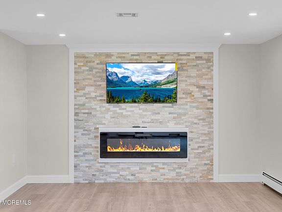 Electric fireplaceCrown moldingMounted tvCustom kitchenCustom stone wallBrand-new asphalt double drivewayHerringbone tiled backsplash