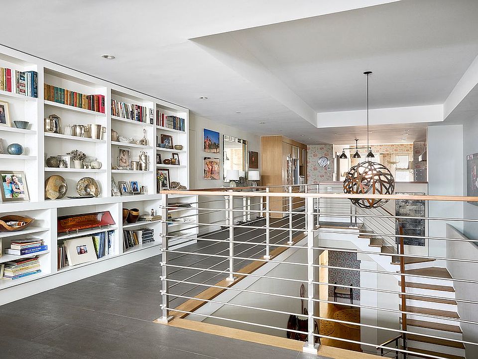 The large living room invites you to linger in front of a gas fireplace flanked by built-ins while a wall of windows captures northern light. A mezzanine hallway lined with custom shelving overlooks the lower level, amplifying the home's grand scale. Ahead, the gourmet Bulthaup kitchen impresses with sleek cabinetry, granite countertops, gleaming tile backsplashes and bold pendant lighting.