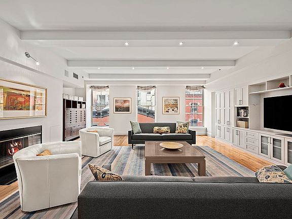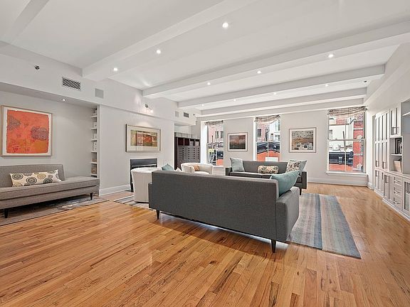 Private key-locked elevator access delivers you directly to this 2,046-square-foot contemporary showplace filled with 10-10,5 foot-tall beamed ceilings, refinished hardwood floors, updated lighting and premium finishes throughout. The oversized living room invites you to gather and unwind alongside a gas fireplace with new mechanicals, exceptional built-in cabinetry and huge north-facing windows framing views of historic Tribeca architecture. Plan your next dinner party in the spacious dining area, and enjoy a gourmet pass-through kitchen featuring refaced cabinetry, a ceiling fan, a pantry and a convenient service entrance. Upscale stainless steel appliances, including a vented Viking range, Sub-Zero refrigerator and new dishwasher, complete the space.