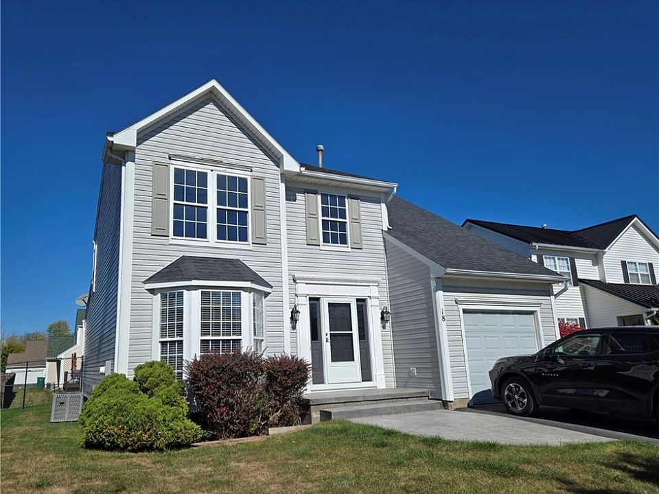 This cute colonial has 3 bedrooms, 2 full baths and a first floor powder room. Newer roof (2017), Asphalt driveway (2017), Front entrance and walkway stamped concrete (2020), New Front door combo (2024), New h/e HVAC (2024), All new flooring o the first floor (2024). A fully fenced back yard, attached garage and double wide driveway (the Town road and infrastructure are being completed 2025). This spacious layout has an open floor plan connecting the living room, kitchen and morning room A formal dining room is off the kitchen. The kitchen appliances all remain with the home (including the microwave), as does the washer and dryer. The second floor has three right sized bedrooms featuring a master bedroom with full bathroom (including a jetted tub, dual sinks and a walk-in shower) vaulted ceilings and a walk-in closet. There are lots of windows to welcome the natural light on both the first and second floor. The attached garage has room for storage. The basement has high ceilings and lots of open space for your storage, work-out space or whatever you invision there. The fully fenced back yard is pet/family friendly. There is a cozy patio off the doors from the morning room and plenty of green space. No delayed negotiations, but plenty of time to move in for the holiday season.