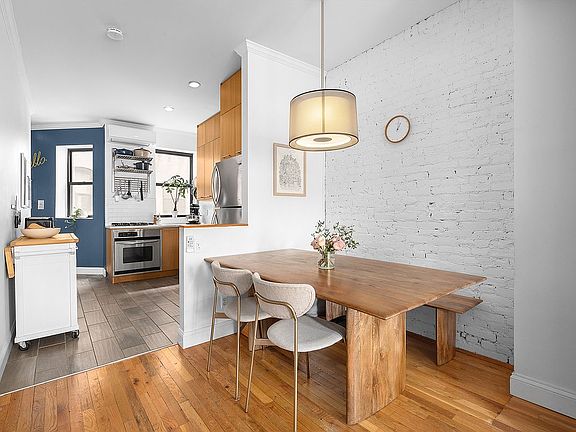Located in the heart of Park Slope, this charming residence blends classic Brooklyn character with modern conveniences, including mini-split AC, an in-unit washer/dryer, and custom built-in storage. The spacious living and dining area is perfect for entertaining, featuring an open flow and large bay windows that flood the space with natural light. A closet-lined hallway leads to the rear-facing bedrooms, ensuring privacy. The primary bedroom boasts exposed brick, a custom-built closet, and an alcove nook-ideal for a reading corner or workspace. The second bedroom features double glass doors, allowing light to filter through while maintaining soundproofing.