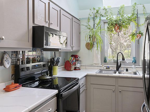 On the first level you're greeted into an inviting living space and dining area, which is directly off from a refreshed U shape kitchen with shaker cabinetry and modern appliances. Thanks to the skylight, the kitchen area is perfectly lit with plenty of natural sun light. You'll also find a half bath with laundry and a pleasantly serene patio space through the sliding doors.