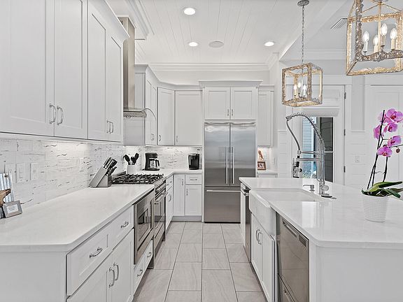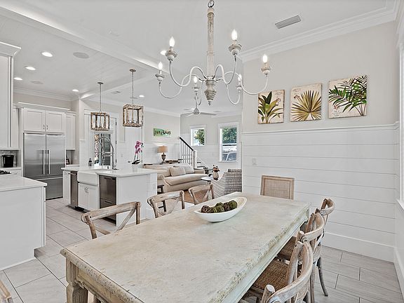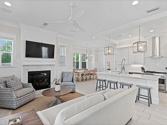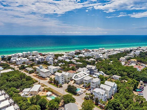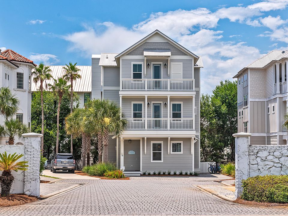 Located just east of Rosemary Beach and a short walk from the soft white sand, this fully furnished beach house was designed for outdoor living. Three floors of contemporary living space spill out onto 695 square feet of outdoor balconies on both the front and rear of the home. They provide an abundance. of outdoor space for gathering together over a barbecue or enjoying your own privacy and peace. This stylishly designed BetterBuilt home features high-quality construction including hardwood flooring, impact/hurricane-resistant windows and a durable metal roof. The open living room on the first floor is beautifully presented with wood-tile flooring, shiplap walls, muted decor and a cozy fireplace. The formal dining area is tucked away in its own semi-separate nook for entertaining. (more) Enjoy your favorite playlist on the Sonos sound system while you relax together. Food lovers will appreciate the gourmet kitchen, which boasts a range of gleaming white cabinets, Fisher & Paykel appliances and quartz countertops. Hop onto a bar stool and chat together at the central island, which houses under-counter appliances and a farmhouse sink. Bedrooms are spread over all levels with the magnificent master suite on the second floor. Kids will have fun making memories in the second-floor bunk room while the third-floor bonus room is a spacious media/game room complete with a wet bar and fridge. The adjoining balcony is the perfect space for watching the sunset and sharing the day's adventures. Available fully furnished and rental ready, this beach house is in a league of its own. To the front of the beach house, there's paved parking for three vehicles and views of the community pool nearby. The home is located within 13 acres of undisturbed dunes making it a nature lover's dream. The beautiful white sandy beach is just down the street and just offshore an artificial reef encourages marine life to flourish. Nearby Camp Helen State Park is a haven for kayaking and paddleboarding on Lake Powell while 30Avenue offers a choice of shops and eateries.