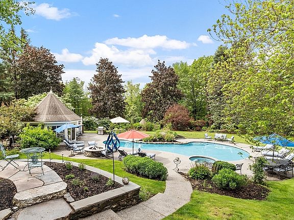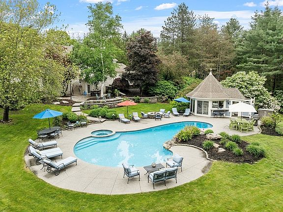 Indulge in luxury living in Leominster, MA. Step into 18 Connors Way, a unique French Manor masterpiece epitomizing exceptionalism. Every room is artfully designed, from the dream kitchen with dual islands, marble countertops, high-end appliances, and a fireplace, to the breathtaking backyard views. The first-floor primary suite includes a custom walk-in closet, custom tile shower, a dual vanity with marble counters, and a private patio. Other bedrooms boast walk-in closets and private, fully customized baths. Herringbone wood flooring adorns the home. Outside, discover a heated pool with a jacuzzi, a pool house featuring a full kitchen, half bath, outdoor shower, and multiple patios for social gatherings. Enjoy a serene Koi pond with a gazebo within the 7 acres of tranquil privacy. The finished basement is equipped with a professional golf simulator, media room, sauna, Bonus room, and an additional kitchen. A heated 3-car garage completes the amenities. Paved biking/walking trail
