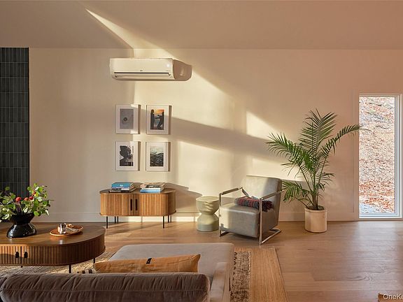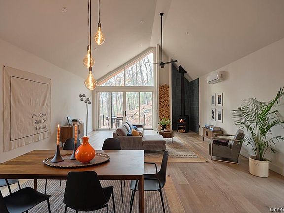 A 2025 new build from the minds behind Chalk Design + Build, Oak Ridge rises from a gentle slope in striking contrast to its forested surroundings - an effortless blend of bold lines and natural beauty. Inside, light pours through a wall of glass framing sunset views over a distant ridge. The open living area features double-height ceilings, a wood-burning stove, and sliding doors leading to a deck and the home’s sleek heated container pool - uniquely designed for year-round enjoyment, from summer swims to winter soaks. The kitchen pairs deep blue cabinetry with stainless steel appliances and a dining area anchored by vintage-inspired lighting. Upstairs, a glass-railed loft overlooks the living room, alongside a cozy bedroom. The lower level hosts the private king-sized primary suite with sliding glass doors opening directly to the pool, a spa-style ensuite bath with soaking tub and rainfall shower, and a generous walk-in closet. A moody blue guest bedroom, full bath, laundry room, and ample storage complete this level. Set on nearly two and a half wooded acres, Oak Ridge offers layered outdoor living — with two decks, a fire pit tucked into the trees, and natural privacy all around. Located just outside Callicoon, one of the Catskills’ most sought-after river towns, the home is minutes from restaurants, cafes and boutiques, plus hiking trails and Delaware River adventures - all just two hours from New York City.