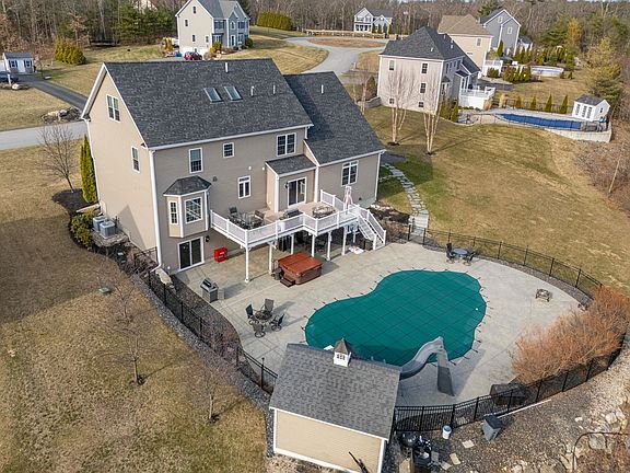 Welcome home just in time for the Summer! This Beautifully Maintained Colonial in Desirable Windham, NH is a stunning 5440 Sq. Ft. colonial featuring 14 rooms, 5+ bedrooms, 4 1/2 baths, 3 Car Garage, and a finished walkout basement with a heated inground pool & hot tub! This home is nestled in one of Windham’s most desirable neighborhoods. Step inside the grand foyer to find an office with French doors leading to the open-concept kitchen with all upgraded SS appliances, tile floor, hardwood cabinets, granite counter tops & double overs. The large granite topped island and built in Sub-Zero refrigerator complete this fabulous kitchen which overlooks the Family room area with a gas fireplace & cathedral ceiling. A formal dining room and living room complete the 1st floor. Upstairs, there is an expansive primary suite, cozy sitting area, large walk-in closet, and luxurious jetted tub and tiled shower. Three more generously sized bedrooms, a separate laundry room, and a full bath complete the second floor. The walkup 3rd floor has 3 more bedrooms and a full bath. The finished basement includes a wet bar, media area, game room, bonus pool table card room area. Walk outside the summer Oasis with year-round hot tub, heated inground pool with a monster water slide and pool house. This area is perfect for summer relaxation. There is irrigation system to maintain professional landscaped yard. A perfect blend of comfort and luxury.