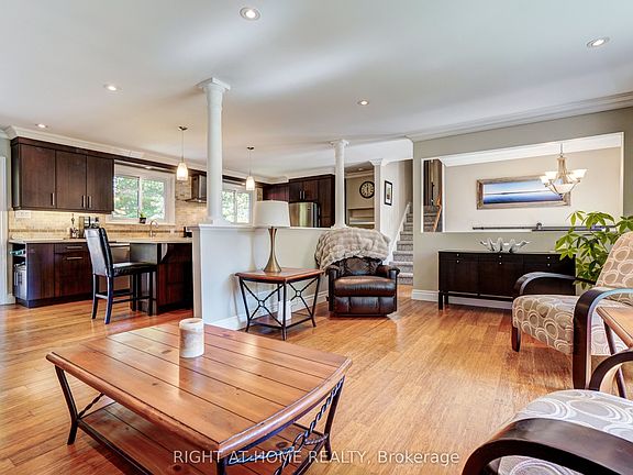 Treasured enclave of Wood River Acres. Sun-filled home on quiet Cul De Sac bordering the Black River , forested land and embraced by nature. This homes peaceful atmosphere backs onto green space with an Impressive 75x180 ft lot ideal for outdoor living. Gorgeous renovated open-concept dining/living/ kitchen with bamboo wood floors, large island with quartz counters, double sinks and two windows overlooking the garden. Smart redesign created an enlarged principal bedroom with 2-pc ensuite. 7 car parking leads to direct garage access and opens to a generous 8x8 mudroom into the main house. Two walkouts - dining room to new deck & rec room to a lower patio overlooking a private fully fenced back yard with pool, hot tub and fire pit. The home has a newly installed furnace & and Air as of Sept 2025. Backing onto protected forest & The Briars Resort beyond offering a peaceful and scenic environment. Enjoy a short walk with easy access to the Black River for kayaking, Lake Simcoe for boating, transit, trails, and local amenities. This rare find has ample space for fun, privacy, entertaining & family. Perfect for families to slow down and enjoy life in a perfect and natural setting.