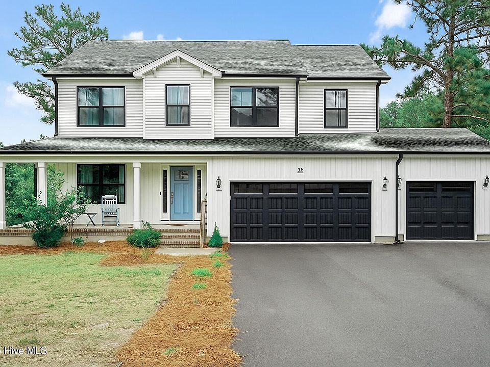 Lakefront living at its finest! This farmhouse-style home sits on over an acre at the end of a quiet cul-de-sac and offers 85 feet of waterfront where you can fish or enjoy electric boating. Inside, the main level features crown moulding and LVP flooring. The gourmet kitchen showcases a porcelain farmhouse sink with brushed nickel finishes, quartz countertops, subway tile backsplash, floating shelves, soft-close white cabinetry, a spacious island, pantry with custom shelving, stainless steel appliances, and a custom vent hood. The dining room features a coffered ceiling, while the living room is highlighted by a shiplap fireplace with a wood oak mantel. A main-level laundry room with utility sink and a half bath with a porcelain sink and brushed nickel faucet add everyday convenience. Upstairs, the owner's suite boasts a tray ceiling, sitting nook, clawfoot tub, walk-in shower, double vanity with quartz counters, and a private water closet, plus a walk-in closet with custom shelving. Additional bedrooms and a loft provide flexible living space. A huge back deck overlooks the lake, and the home also includes a three-car garage with parking pad and a large crawlspace for extra storage.