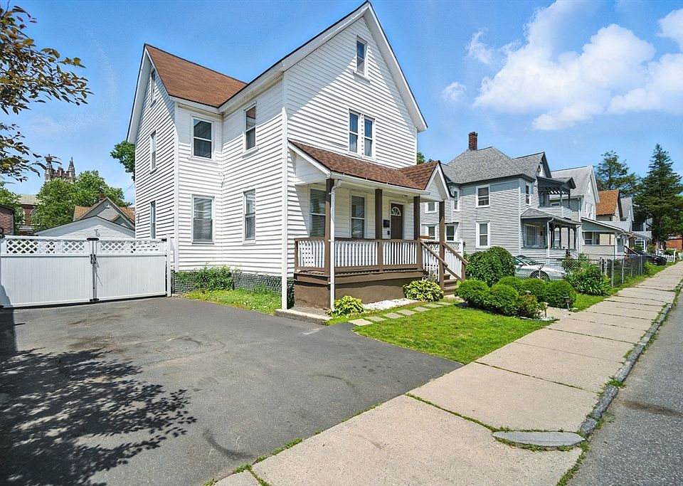 Welcome to this beautifully maintained Colonial offering 3 spacious bedrooms, a finished attic perfect for family room, game room or guest space, and a partially finished basement ready for your personal touch. Enjoy summer days in the pool and nights around the fire pit in the backyard. A newly built garage adds convenience and storage.Thoughtful updates within the past 2-3 years include new kitchen cabinets, updated appliances (range, refrigerator, microwave) —all to remain including washer and dryer, upgraded insulation, and major electrical and plumbing improvements. This home blends character with efficiency and peace of mind. Stay warn and cozy all winter with the pellet stove that efficiently heats the entire home. Located close to public transportation, schools, and highly regarded colleges—this property offers both comfort and convenience. A true must-see!