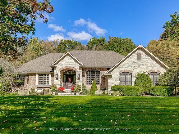 This well maintained executive 4 (3+1) bdrm custom BUNGALOW with approximately 4470sf of beautifully finished living space combines rural serenity with urban conveniences: a perfect blend of country living and luxury. It is situated on a much sought-after cul-de-sac nestled in the quaint village of Carlisle. The manicured half-acre+ lot backs and sides on to beautifully treed conservation lands. The semi-open concept main flr has been freshly painted throughout, & features an integrated living area consisting of a well-appointed and fully updated eat-in kitchen with 2 magnificent islands accommodating seating for 10 with high-end app (Miele oven/speed oven combo & dishwasher + Jen-Air fridge), and a family rm with a stone façade gas fireplace framed by complementary book shelving and cabinetry. The elegant custom cabinetry offers an abundance of storage. This level also includes an inviting living rm and an oversized dining rm accented by a beautiful coffered ceiling. The generously sized primary room retreat has a 5-pc. ensuite w/i closet. There is also a 5-pc.bath, 2 bdrms, a laundry rm and a 2-pc. bath. Enjoy the luxurious heated limestone flooring that runs throughout the main level. The professionally finished basement, accessible also from the oversized double-car garage, is completed to the same high level of craftsmanship, with high ceilings and large windows. A 27'X37'rec rm, a 4th bdrm, a 4-pc. bath, a utility rm and 4 additional rms can serve a variety of purposes. Updated light fixtures installed throughout. The extremely private back yard oasis has been beautifully landscaped to include a firepit, water feature, and multiple conversation areas well suited for large gatherings. A stunning custom outdoor rm with an integrated large Masters type hot tub complements the private park-like setting. A sprinkler system assists in maintaining the grounds and extensive perennial gardens. A professionally installed lighting system adds to the evening ambience.