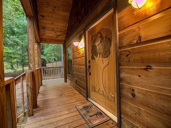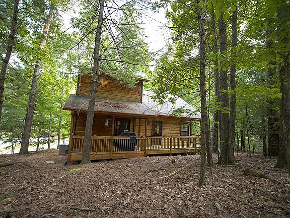 Slow down and take a breath in this unique and charming, fully furnished modern rustic cabin. Enjoy the privacy of gated access and the serenity of a quiet street, all within a five-minute drive to groceries and shopping. Each master suite boasts an oversized bedroom with a wall-mounted television, a private bathroom with separate toilet stalls, and a walk-in closet. The main level master bath features a large jetted tub with a wall mounted television, while the upstairs master bath sports a shower built for two with separately controlled heads on the wall and ceiling. Wood floors, walls, and ceilings throughout exude warm, rustic charm. A wraparound deck is accessible directly off the main level master bedroom. Laundry and an additional half-bath are also located on the main level. The living room features a vaulted ceiling and gas fireplace. A gentle, wooded lot offers an outdoor campfire area and plenty of room for a shed. Community amenities include a weight room, three pools, mini-golf, and river tubing access. A pool and a park with Coosawattee river access are both within walking distance of the cabin. High speed internet and cable TV are available. Cleaned, furnished, and ready to move in or rent. This beauty will not last, so schedule a showing today.