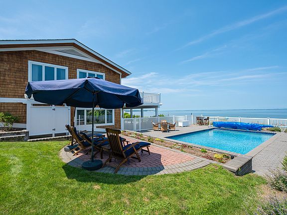 Turnkey and fabulous open floor plan with a spacious den, gourmet eat-in kitchen and living room with wood-burning fireplace. Sliders open to a spacious covered entertainment patio with outdoor kitchen steps from the heated gunite pool and outdoor shower. A private sugar sand beach is perfect for sunbathing, swimming, kayaking, boating, waterskiing, and paddleboarding. The second floor includes an ensuite master bedroom, 3 additional guest suites and a spacious sundeck for reading & sunbathing. Central air and hardwood floors are just a few of the fabulous amenities. Equidistant between Southampton Village and the Hamlet of Hampton Bays this easy beach retreat is centrally located yet tucked thoughtfully away on a quiet bayfront street. Endless stunning Peconic Bay views and southwestern sunsets make every day a Beach Day!