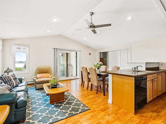 Premier Minot Location! Set on a quiet side street "between the lights" this sun filled 3 room waterfront condo overlooking Musquashicut Pond offers a great coastal lifestyle for year round living or a great "pied-à-terre". Spacious open concept cathedral living room, dining area and updated kitchen opens to a large porch overlooking the beautifully landscaped yard and water views. Bedroom with double closets and cove lighting. Updated full bath with laundry. 2 deeded parking spots. Ample storage with a pull down attic and large first floor mechanical storage area. Set on a three quarter acre lot the property provides a generous common yard and great parking. Steps to Minot Beach and Hatherly Country Club.