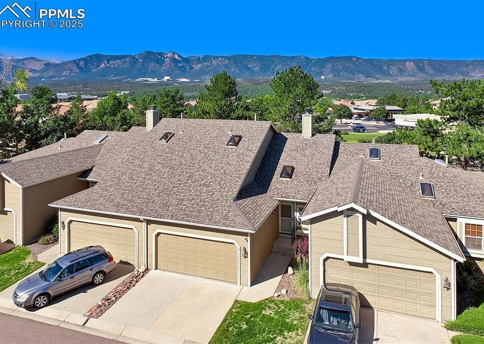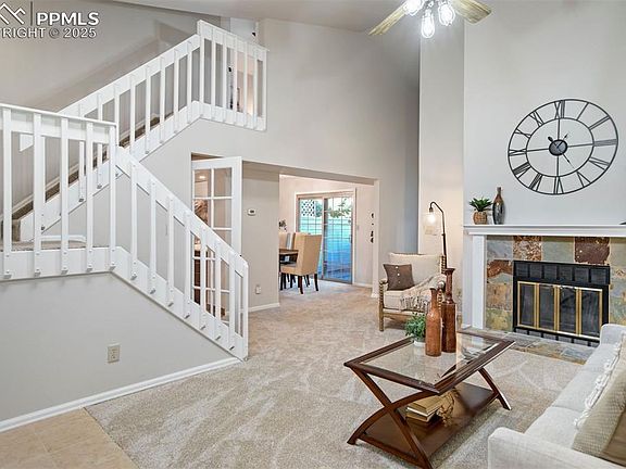 Freshly updated and move-in ready, this lock-and-leave townhome in the heart of Gleneagle offers a rare blend of privacy, beauty, and ease within coveted District 20. With no rear neighbors and a natural enclave of trees behind the home, the setting feels sheltered and serene, while the upper level captures inspiring mountain views framed between the treetops. The main level welcomes with a slate-accented gas fireplace, a kitchen with ample workspace for the chef, stainless steel appliances, and a breakfast bar pass-through into the dining area. Seamless flow extends outdoors with dual access to a fenced patio, offering privacy for morning coffee or pets at play. The layout includes two primary suites—one on the main level (currently styled as an office) and one upstairs with an en-suite bath and walkout to a composite deck where the views unfold. The finished lower level extends the living space with a third bedroom, an L-shaped family room suited for fitness, office, or recreation, and a newly renovated bath with laundry access. Recent updates include fresh interior paint, new carpet, modern lighting, and a refreshed lower-level bath. An attached two-car garage provides everyday convenience. Designed for a maintenance-free and fluid lifestyle, this residence invites you to embrace Colorado living at its best—whether enjoying the Gleneagle trail system, dining nearby, or the ease of connection to I-25, the Air Force Academy, and the vibrant Interquest corridor.