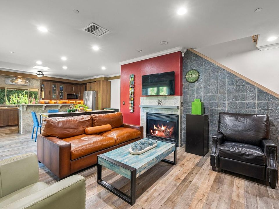 Gas fireplaceWet bar or kitchenettePrivate entranceClean modern living designFresh paintNew flooringUpdated tile work