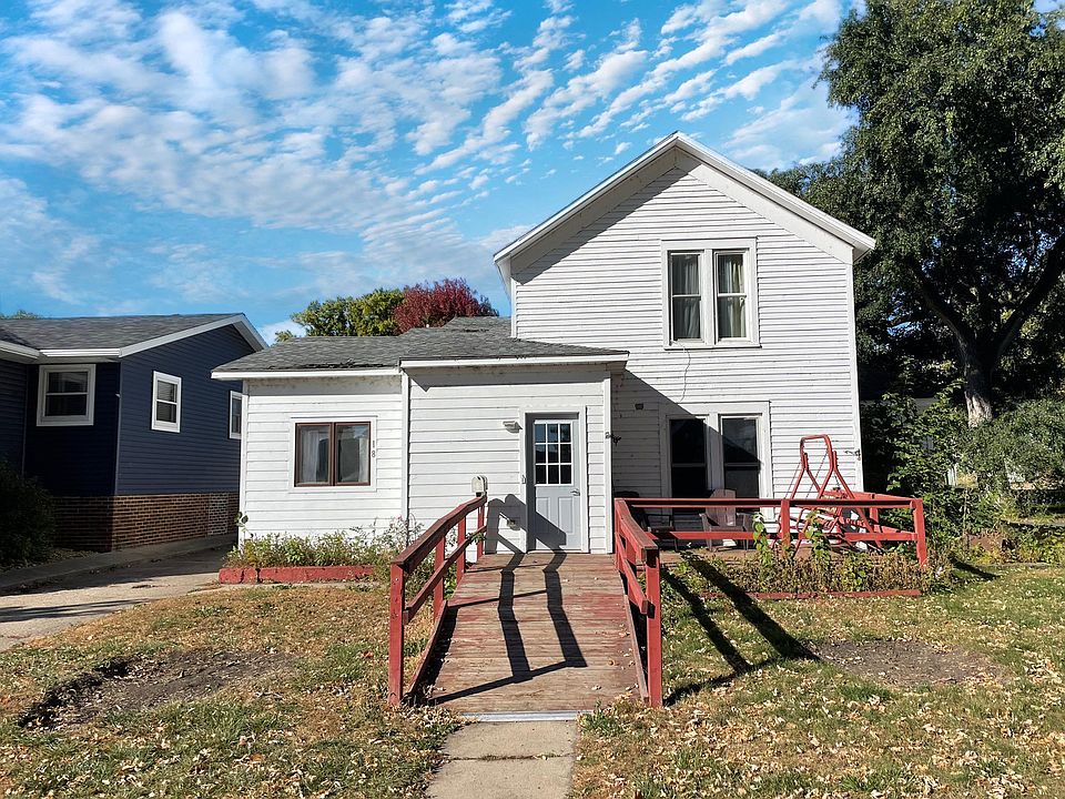 Conveniently located close to downtown and the schools, this 3 bedroom, 2 bathroom home features a spacious, bright eat-in kitchen, a main level bedroom and bathroom/laundry room, a large living room with hardwood floors and a patio door leading out to the backyard, and an upper level full bath situated close to the two bedrooms. The backyard has a detached 24' x 24' garage, alley access, and great shade coverage!