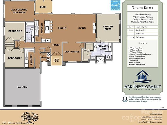 Custom home plan features single level living with relaxing views looking over a creek and at up at the mountains. The great room connects to a covered deck and fully conditioned all seasons room. The views out the back of the home use higher ceilings and extra windows to provide ample light and mountain views. Energy Star Certified (in process), the home features improved insulation, enhanced heating and cooling and Energy Star appliances including an induction range.