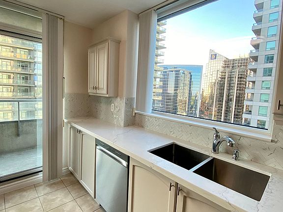 Corner unitModern kitchenStainless steel appliancesQuartz countertopsAmple cabinetryConvenient in-suite laundry