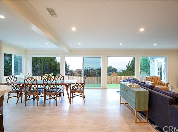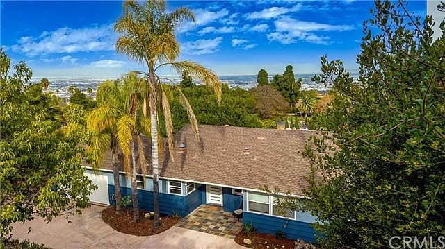 Serenity awaits as you step into a beautiful, nicely updated modern one-level home with a 180 degree panoramic city and mountain views spanning from down town Los Angeles to the Ports of Long Beach. As you enter the home you are greeted with the open floorplan and views straight out to the snowcapped mountains. The kitchen was renovated in 2019 with quartz countertops, updated cabinetry, and an awesome layout including seating at a bar top. The countertop extends into a pantry area with pull out maple lined shelves and a secondary electric oven. The kitchen opens up to the Great Room which boasts floor to ceiling windows, an updated fire place, skimmed ceilings, LED lights, updated furnace and AC plus wood laminate floors and updated double pained windows. The house has two large bedrooms and a very large primary bedroom that is currently used during the day as a home gym and office. There are 2.5 bathrooms plus an outdoor shower, which is fantastic to use after coming home from the nearby beach. The flat backyard was recently redone with plush turf grass, a charming fire pit and a wooden fence to separate the yard. Below the main yard there is tremendous opportunity as the lot overall is nearly half an acre and includes an old horse barn and a lower flat area. With over 2,000 feet of living space this home has great flow for easy living. The property is located close to shops and the outstanding schools of Palos Verdes.