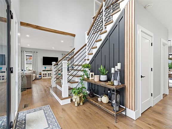 This newer constructed home brings a modern industrial farmhouse presence to one of East Islip’s standout blocks. A two-story foyer with custom accent walls and a grand staircase with sleek black railings sets the tone immediately, opening into an airy layout centered around a chef’s kitchen with a walk-in pantry, butcher-block details, and Thermador appliances. It’s a true entertaining space: purposeful, warm, and adaptable for any gathering.