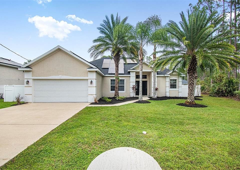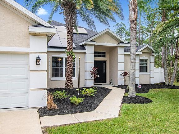 Come take a tour of this beautiful move in ready 4 Bedrooms, 3 Bathrooms and a 2 Car Garage home in the Seminole Woods Community. This home features a bunch of upgrades as follows: Roof was replaced in 09/2024, HVAC was replaced in 12/2024, Water Heater replaced in 2023, exterior paint 2024, interior paint 09/2025, Garage Door replaced 09/2021. You will also enjoy a bunch of extra bonus items as follows: Solar Panels installed only 2 years ago and will be paid off in full at closing and ownership will be transferred to the new owners giving the new owners of this lovely home great benefits at no costs to them, Home Warranty paid through 09/2027 that covers all appliances and more and Termite bond paid through 2031. This home is fully fenced in and has a storage unit. This home is conveniently located near Town Center and I-95 and is about 10 minutes away from the beach. It's just a short drive to the Daytona Bch, St. Augustine, and less than 2 hours to Orlando and jacksonville airports. It is also conveniently located near Dept. Stores, Drugs stores, Supermarkets, Restaurants and so much more!!!!!!!