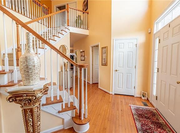 GORGEOUS move-in ready & meticulously maintained 4 bed/2.5 bath Colonial in the ultra desirable subdivision of Fox Run Estates! Enter into grand 2-story central hall foyer w/stunning angled staircase. Elegant formal living room is adorned w/2 large bump-out windows & pillars in entryway leading to spacious formal dining room. Charming yet large family room is a great place to gather around the fireplace! Large kitchen boasts oversized center island & pantry! Beautiful sunroom has Cathedral ceiling & large Palladium window! Conduct uninterrupted business in den/study w/access to driveway! Magnificent master bedroom has vaulted ceiling w/fan, sitting area by the window & updated luxurious master bath! FULLY finished daylight basement offers sitting area, rec area, bonus room & full bath! ENORMOUS wooden deck leads to covered paved patio in fully fenced yard & is PERFECT for entertaining or simply relaxing! 2-car side entry garage w/paved driveway