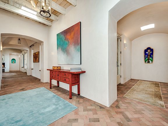 Rastra built beauty by award-winning Paragon Builder and winner of four awards in the Hacienda Parade of Homes! Own a slice of paradise where peace, privacy, and panoramic views exist. Located on a paved dead end cul-de-sac, this 2.5 acre lot is a perfectly sited single level solar equipped, and owned, with new battery back-ups which equals zero negative bills! All utilities are underground for unobstructed 320 degree views of three mountain ranges. One enters through a walled courtyard replete with fountain into a spacious sanctuary with higher than high beamed ceilings. Hand troweled plaster walls, tumbled herringbone brick floors, wide plank wood floors and vaulted ceilings. Normanesque archways, custom solid wood doors with deep set scalloped archways. Bathed in light, the Living Room's French doors flank the Vermont Casting wood stove and lead out to a secluded sheltered patio. Split bedroom floor plan. Ensuite Grand Master with fireplace, office and sitting areas and private pergola covered patio. The large luxurious bathroom has heated bancos, jetted tub, separate shower and a ginormous walk-in closet. Eat-in Kitchen is a cook's delight & is absolutely perfect for entertaining a multitude of guests. Oversized slab granite island with prep sink, fireplace, walk-in pantry, office area and a private, pergola covered patio for breakfast or bbq-ing. Two guest bedrooms share a Jack 'n' Jill bathroom and have access to the portal. Powder room, huge utility room with sink, cabinetry and folding area, central vacuum, built-in sounds speaker and 34 skylights. 1,200 sq. ft. of covered portals for al fresco dining and Margarita sunsets. Three fabulous fireplaces, central vac, closets and storage galore, non-toxic, low VOC, wherever possible, and a shared well maintained by the HOA. Water-wise organic regenerative gardens with mature trees, vegetation & a pet-friendly enclosed back yard. Last, but not least, A three car heated garage. This property is not to be missed!