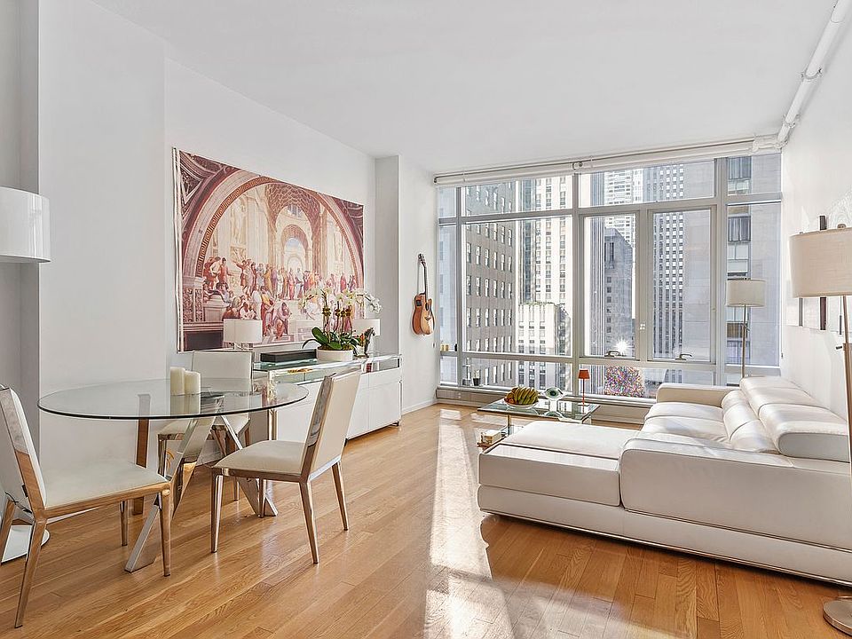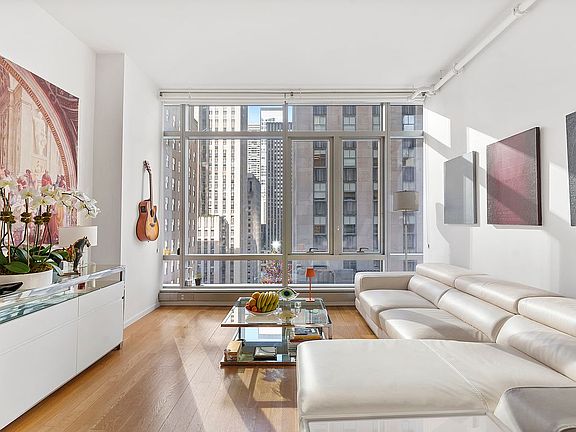 Inside this sun-splashed 918-square-foot residence, tall ceilings and hardwood floors are illuminated by walls of north- and south-facing windows. An inviting foyer with an oversized storage closet ushers you into the dramatic 23-foot-long great room. Here, you'll find a generous footprint for living and entertaining alongside show-stopping city views, including a direct line of sight to the famous Rockefeller Center Christmas tree! Folding doors reveal a well-appointed Pullman kitchen featuring glossy cabinetry, a stainless steel counter, a refrigerator, a cooktop and an oven. Sleep soundly in the sunny, south-facing bedroom offering king-size proportions, room for a home office area and a wall of reach-in closets. The en suite marble bathroom impresses with a soaking tub, glass shower, floating double vanity and wide medicine cabinet. A convenient powder room with an in-unit washer-dryer completes this magnificent Midtown home.