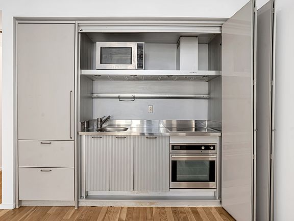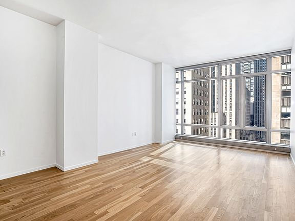 Direct views of Rockefeller Plaza provide the spectacular backdrop to this apartment at the Centria, located in the Midtown West neighborhood. It's a sunny, loft-like apartment which boasts stunning, floor to ceiling windows, a state of the art "folding" Driade designed kitchen, with stainless steel appliances, granite slab counters and custom glass cabinetry. Both bathrooms have limestone flooring, Calacatta marble walls and counters with beautiful Waterworks hardware. The luxurious en suite master bath has a double vanity, oversized soaking tub and separate thermostatic shower, and the half bath also neatly tucks away brand new the Bosch washer and dryer. Living room and bedroom pictures are virtually staged.