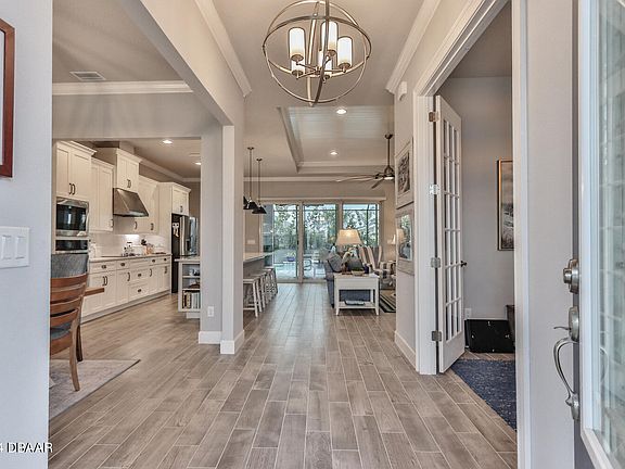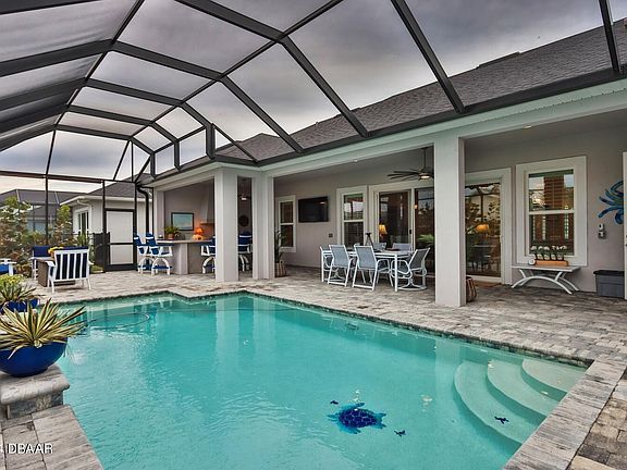 Welcome to 18 Watchtower Drive, where luxury and coastal style meet in this stunning custom Verona Oceanside home. The owners spared no expense during the design phase, resulting in a truly remarkable home that is now ready for your enjoyment. As you enter, you will be greeted by the open, bright & airy feel with high-end finishes and vaulted ceilings. This gorgeous, customized ''Marlin'' plan home was built by ICI in 2022. The home boasts a split plan with three bedrooms, an office & two & a half bathrooms, including a designated pool bath. The heart of this home is the designer kitchen, featuring quartz countertops, chef quality appliances & a large island ready for entertaining. Every detail has been meticulously crafted. The beautiful wood-look porcelain tile floors in the living area add a touch of warmth and elegance while the shiplap in the tray ceiling of the family room adds a unique design element. Custom plantation shutters adorn every window, plus custom motorized shades on the sliders in the family room, allow you to control natural light and privacy with ease. The upgraded light fixtures and ceiling fans add a touch of sophistication to each room. The upgrades don't stop there. Step outside into your own private oasis. Enjoy the custom inground pool with a waterfall feature surrounded by an oversized covered lanai with a paver patio. Entertain all year long with the fabulous custom outdoor kitchen/bar with sink, wine cooler, LeGriddle stainless steel griddle, & vent hood. The extraordinary outdoor entertaining area comes complete with a pool cage that features attached privacy panels and custom Koolaroo outdoor shades. The extended roofline ensures ample space for hosting family & friends, creating a haven for relaxation. This space is designed for Florida lifestyle living all year long. Let's not forget about practicality. This home boasts a three-car garage with epoxy floors, providing ample storage space for all your vehicles and beach toys. Additional upgrades include expanded columns and trim at the front of the home. What can be better than enjoying your private, neighborhood deeded, beach access just a short distance away. Enjoy a day at the beach surfing, fishing, soaking up the sun & then cool off in your private pool. Follow up the perfect day watching the gorgeous sunset at the nearby Intracoastal waterway. Conveniently located close to restaurants, shopping, and Publix. Life is a dream in Ormond By The Sea, a quaint beach town with a small town feel. Don't miss the opportunity to make this remarkable home yours! Schedule a visit today.
