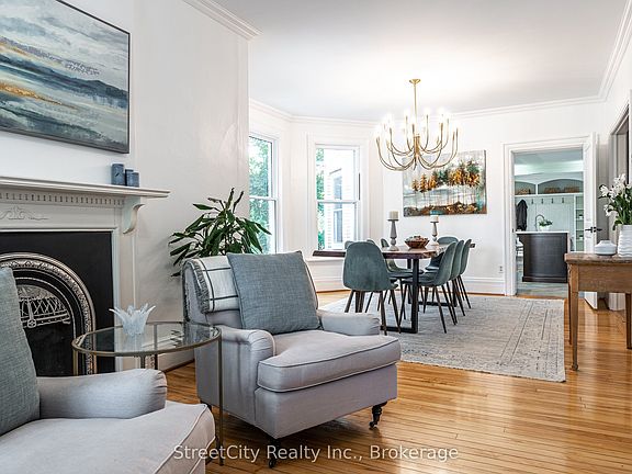 Welcome to this extraordinary century home, perfectly situated at the corner of Waterloo and William Streets in the heart of Stratford. Offering over 3,000 sq. ft. of beautifully revitalized living space, this 5+1 bedroom, 6+1 bath home combines timeless character with inspired modern renovations and additions. The main floor is designed for gathering and entertaining--walk in to an inviting living room with gas fireplace, an open-concept dining room, a cozy family room, and a private study with custom built-ins, all enhanced by blonde hardwood flooring and exquisite trim work. The chef's kitchen boasts a commercial-grade gas range, double dishwashers, quartz island with prep sink, heated tile floors, and bay windows with banquette seating overlooking the Avon River. The second level is thoughtfully divided. The private primary suite is flooded with natural light and features river views, a walkout balcony, cozy sitting area with fireplace, walk-in closet, and spa-inspired ensuite with heated floors. In the east wing, three additional bedrooms each enjoy their own ensuite baths, with two offering private balconies. A finished third-floor attic suite with private entrance and its own 4-piece bath completes the upper living space. The lower level provides abundant storage, an oversized laundry room with 2 washers/2 dryers, a sixth bedroom with ensuite, and a hidden children's playroom. Outdoors, mature landscaping, a private rear courtyard, dual driveways, and a carport add convenience and charm. All of this, just steps from the Avon River, the new Tom Patterson Theatre, world-class dining, lush parks, and Stratford's vibrant downtown shopping district. This is more than a home--it's an opportunity to own one of Stratford's most desirable addresses. Contact your REALTOR today for details or to arrange a private showing.