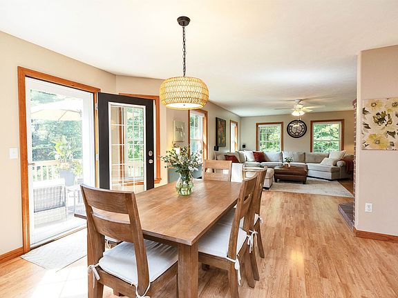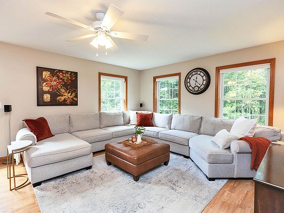 Beautiful Farmers Porch Colonial 4 bedroom on just under 2.5 acres, set in a quiet and private development with easy access to commuters routes. Enter the home via the farmers porch and continue through the entry hall into the spacious kitchen with a large pantry, custom built in, countertop seating and a breakfast nook with access to the deck and back yard. The living room is filled with light and features a wood stove set in a brick hearth, a cozy supplement to the efficient Buderus boiler. A bright dining room with a bay window, a large closet and a half bath finish the main level. Upstairs, relax in the primary bedroom that includes walk in closet space and a double vanity ensuite bath with linen storage, a stand up shower and soaking tub. 3 additional bedrooms and a second full bath round out the second floor. The full basement has a finished rec room, a workshop area, a large pantry room with the option to turn back in to a room with a closet, and utility space with a walkout double door to the back yard. Radiant heat on main level and in part of basement. Baseboard heat on upper level. Two car garage fits large vehicles and has loads of storage. Paved driveway for easy parking and maintenance. Great New Ipswich location, private yet just over an hour to Logan, 20 minutes to the Fitchburg commuter rail and 50 minutes to Manchester Boston Regional Airport. Showings begin at the Open Houses 10/4/25 from 12-3 and 10/5/25 from 11-1.