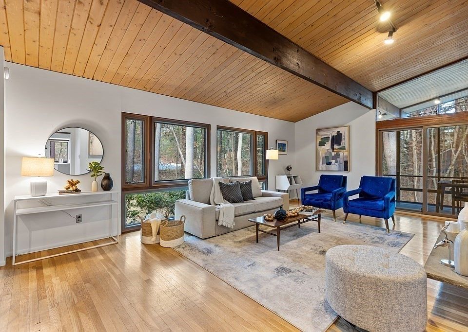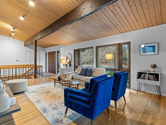Welcome to your grand Core Mid Century Contemporary home. This home seamlessly blends with the natural surroundings in quiet cul-de-sac neighborhood. The home offers an open and flexible floor plan. Beamed cathedral ceilings and walls of glass compliment this awesome home, which boasts a beautiful high end 2022 kitchen, eat-in area, outstanding sun-filled dining room and large fire-placed living room. Oversized screened porch welcomes the outdoors in; gas grill set-up and new Trex deck. Inviting large primary suite with walk-in closet and bathroom, three additional generously sized bedrooms, family bath and laundry. Walkout lower level is flooded with natural light from sliding glass doors, home office, den, playroom, entertainment space, exercise room/spa tub and mudroom with ample storage. New HVAC 2024, central air, two car garage and additional garage/shed for third car. Gorgeously landscaped, with flowering trees, pathways, stone walls and level back yard. Your own oasis!
