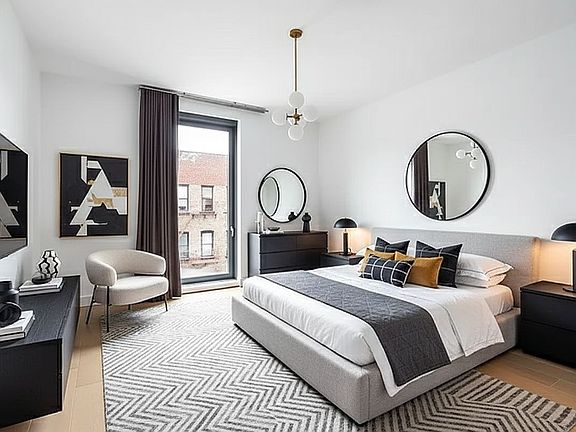 Through double doors, the primary suite offers a serene retreat complete with a walk-in California Closet and dressing area. The windowed primary bath is luxuriously finished in marble, with a rain shower, double vanity, and ample storage. A second bedroom—also with a windowed en suite bath and bathtub—sits conveniently near the powder room, which features Waterworks Architectonic wall tiles, a St. Germain marble sink, and a Jacques Adnet Circulaire mirror. Additional features include an in-unit washer and vented dryer, as well as a private storage room in the building’s lower level.