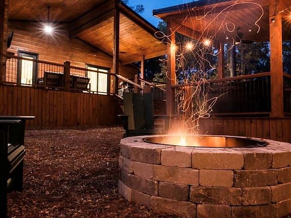 Follow the stairs down to a private cabana area featuring a hot tub, perfect for relaxation under the stars. Just beyond that, a firepit area invites guests to make s’mores and lasting memories around the fire.