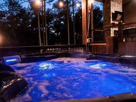 Private cabana areaHot tubAlfresco diningFirepit areaWooded acresInviting designOutdoor stone fireplace