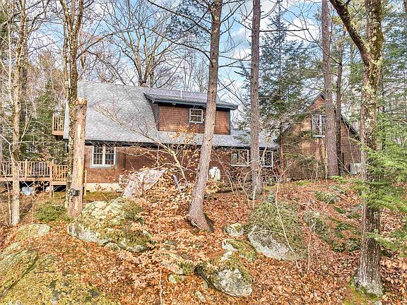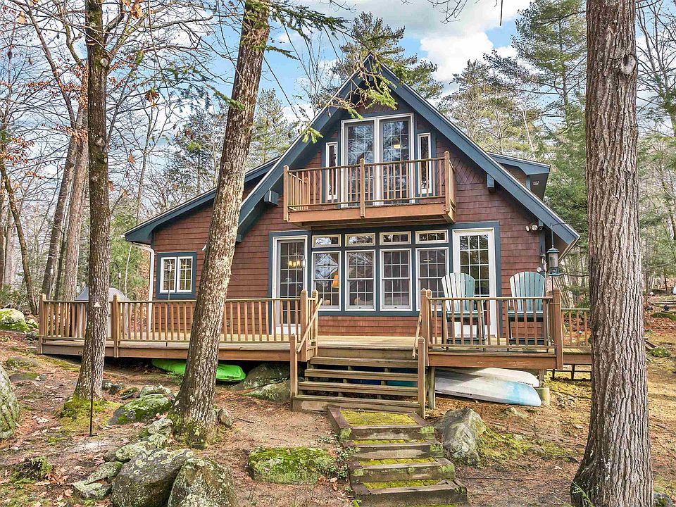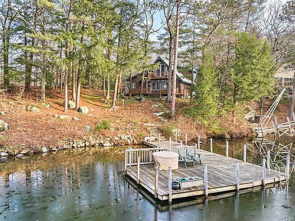 Rare Winnipesaukee waterfront offering on desirable Black Cat Island. Adorable 4 bedroom home, with an open concept floor plan, a cozy fireplace that has a wood stove insert, in the center of all activity with a nice staircase to the second floor that winds around it. First floor bedroom (currently used as a library) and bath, 2 bedrooms that share a large bath on the second floor, one with a balcony overlooking the lake, another bedroom suite is above the attached garage. Some great features include, hardwood and tile floors, mini splits for extra heat but also AC, soapstone counters and sink in the adorable kitchen with nice appliances, main floor laundry, lots of windows facing the lake, a huge deck accessed by sliders, on the water side of the house, but also a deck over the water with a nice walkway connecting the two decks. Many recent upgrades include, new roof, mini-splits, water pump, insulation in garage, upgraded electric and plumbing, hot water heater. The Lake Frontage has nice private, oversized dock/deck on the water and a nicely landscaped lot in a protected cove, yet seconds to open water. Black Cat is bridged island for year round access and is a great location to get to shopping, restaurants, hiking and attractions by boat or by car in a very low tax town. Also less than an hour to several ski areas, a true year round retreat!