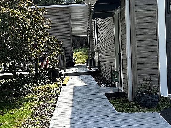 Hot tubSliding glass doorTin roofAttached storageRoofed deckEntrance into kitchen